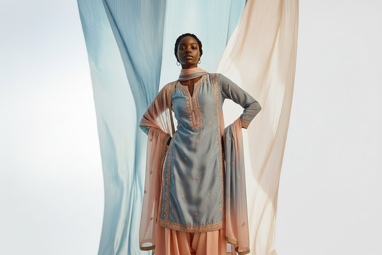 Azure Dream: Embroidered Kurta Set with Opulent Banarasi Dupatta